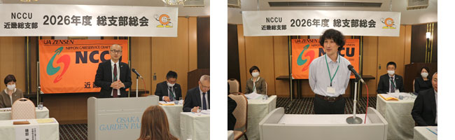 冒頭、主催者の挨拶として、磯部徹総支部長より「日頃の組合活動への参画に対する感謝」の意が表され、加えて、NCCUの直近の活動・成果についても報告がありました。また、上部団体であるUAゼンセン大阪府支部からも鈴木充次長が来賓として参加いただき、総会開催にあたっての祝辞をいただきました。