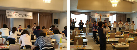 実際に体を動かしながら体験する「音楽ヘルパー」の講演。参加した皆さんにも好評でした。